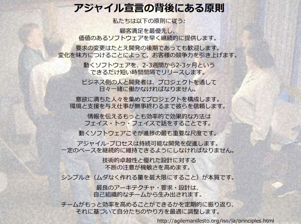 そして、このアジャイル開発を実現するために、従うことが望ましい原則、つまり根本的・根源的な取り組み姿勢について「アジャイル宣言の背後にある原則」に明記されています。