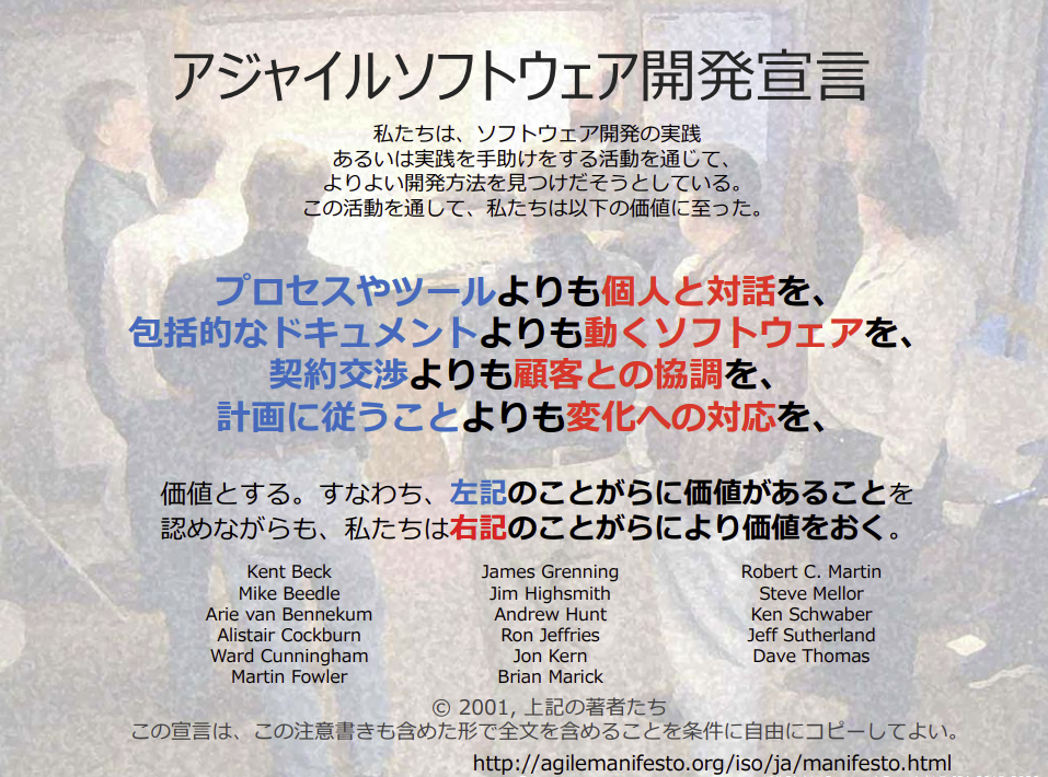このアジャイル開発におけるマインドセットは、従来型のソフトウェア開発のやり方とは異なる手法を実践していた17名のソフトウェア開発者が、それぞれの主義や手法についての議論を行い、2001年に「アジャイルソフトウェア開発宣言」として公開します。そこには、彼らがソフトウェア開発を行ううえで重視している「マインドセット」が書かれており、このマインドセットが、世界中のソフトウェア開発者達に支持され、”アジャイルソフトウェア開発” という名で呼ばれるようになりました。